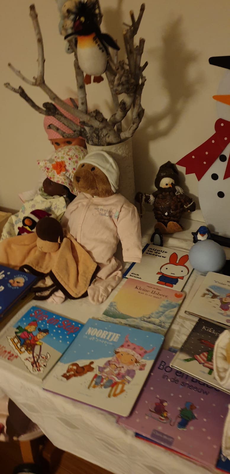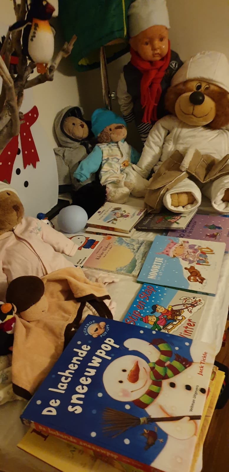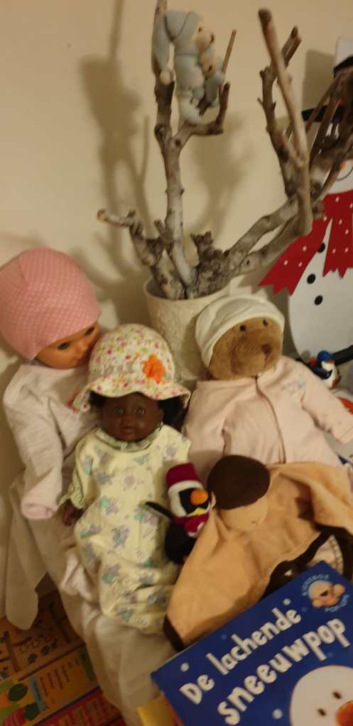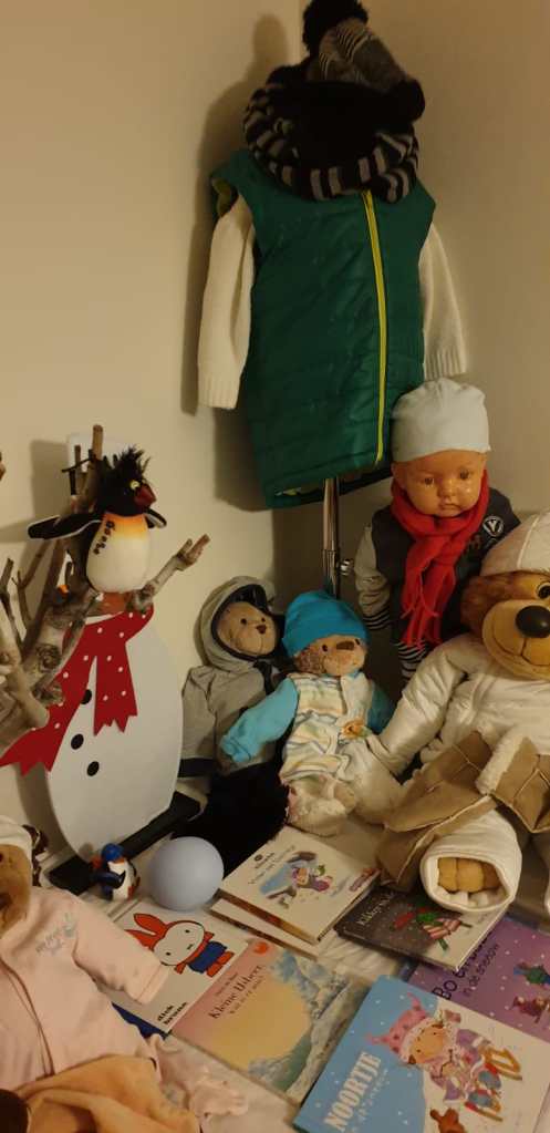 Tot nu toe hebben we in dit nieuwe jaar 2021, het moeten doen met slechts 1 dag sneeuw. Zaterdag 9 januari 2021. Op sommige plekken een redelijk pak sneeuw, die wat langer bleef liggen. Het is voor het eerst in zevenhonderd dagen dat er een pak sneeuw in ons land kwam te liggen. Jammer, anders had ik samen met de grote kinderen van Rani’s speelhuis een sneeuwpop kunnen bouwen in de achtertuin. Desalniettemin hebben we net als vorig jaar ons speelkwartier voorzien van de nodige “medebewoners” ,helemaal ingepakt ..winterproef.
