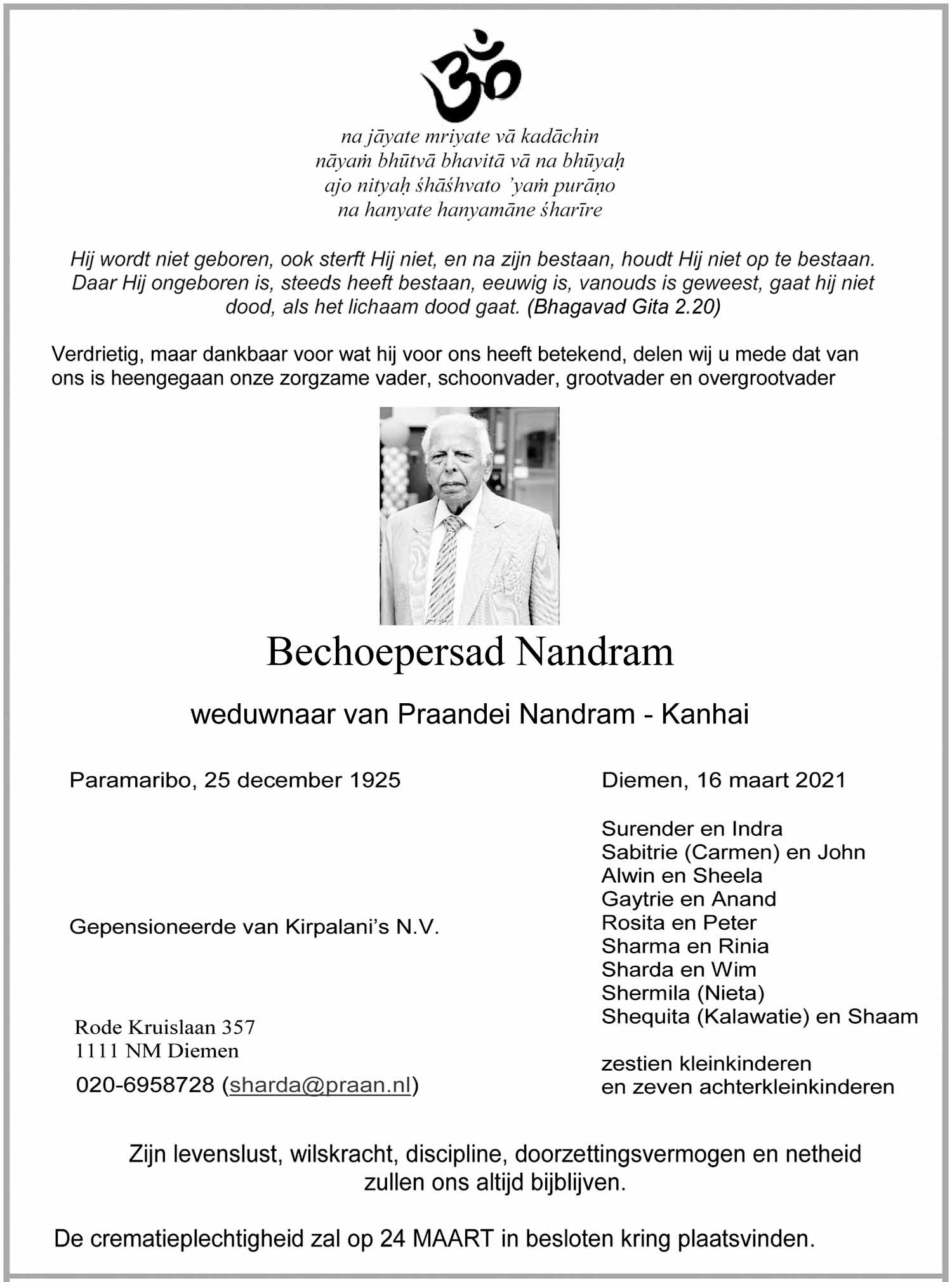Hartverwarmend dat zovelen met ons hebben meegeleefd na het heengaan van onze vader, schoonvader, grootvader en overgrootvader Bechoepersad Nandram. We willen U hartelijk danken voor uw kaarten, bloemen, berichten en bezoek aan het rouwcentrum. Het deed ons goed om te horen dat hij enorm werd gewaardeerd en velen heeft geïnspireerd.