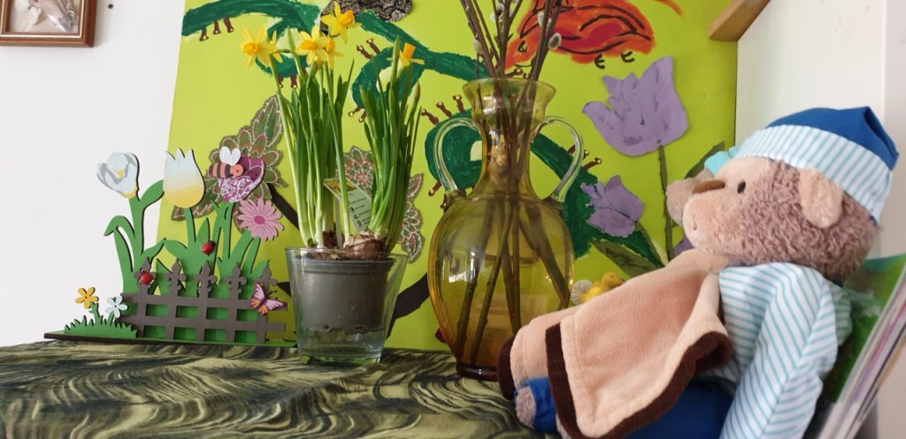 Je voelde al dagen die aangename prikkelende steekjes in je gezicht of in je nek. Voorbode van de lente. Dat was het. De mooie lente is weer gearriveerd en we mogen weer volop genieten van al het mooie, die de natuur ons biedt. Ook Rani’s Speelhuis staat weer volop in het zonnetje. De voortuin met name. Grote schoonmaak achter de rug. Zoals elk jaar heb ik binnenshuis een lente-hoek gecreëerd voor de kindertjes. ‘ Wanneer de lente begint, de ingedommelde takjes en knopjes ontwaken, vliegen de pimpelmees of merels voorbij . De kleuren van de zon dansen voorbij de horizon. De kindertjes lachen en zijn blij. ‘